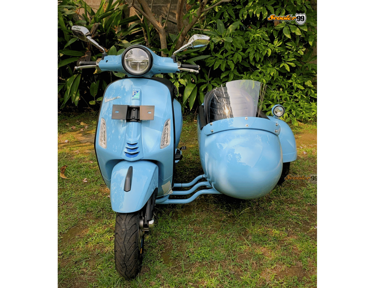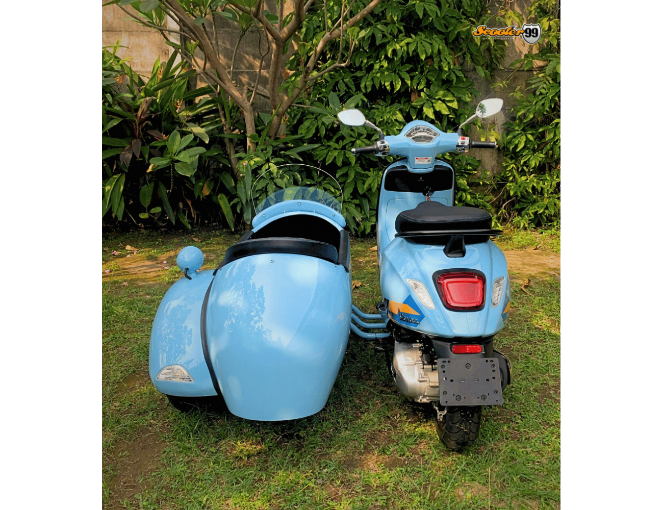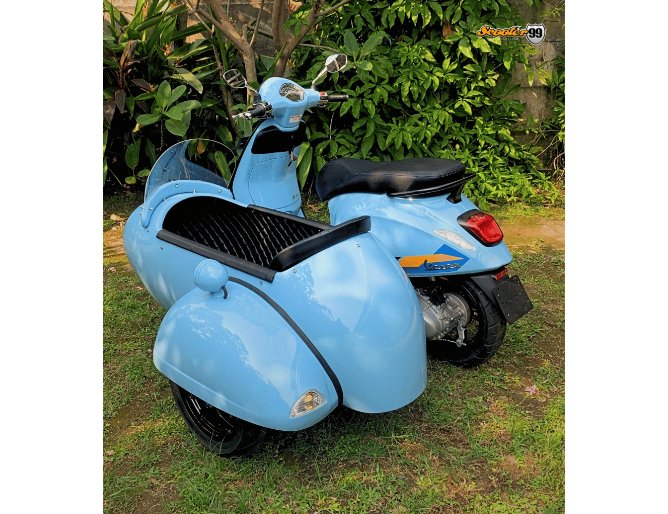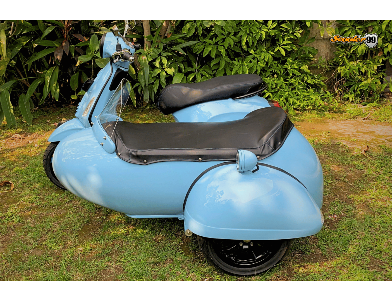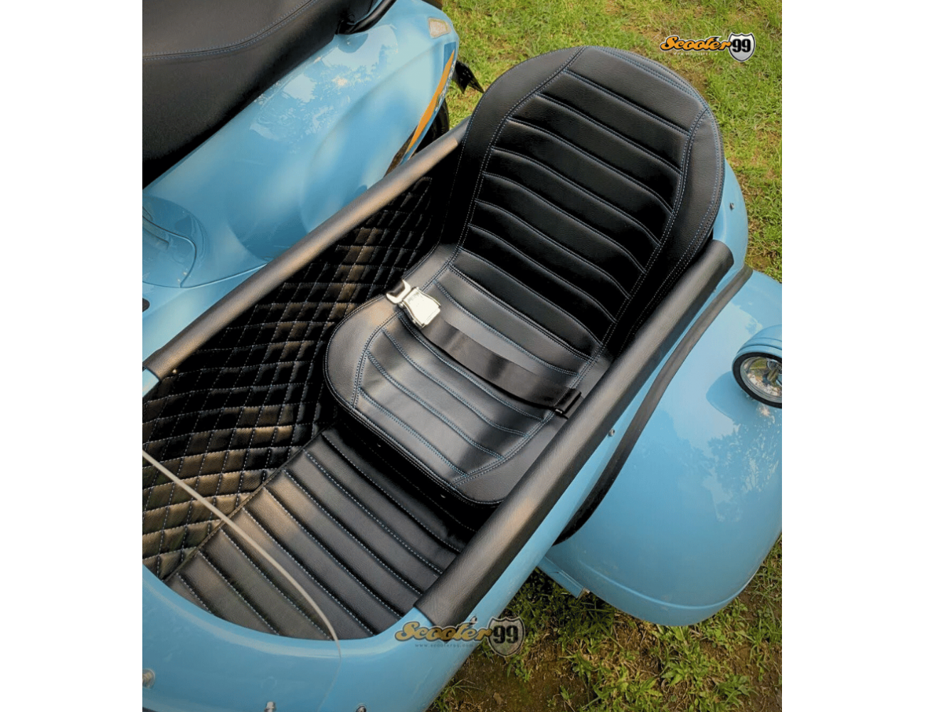 The Sidecar Baby Blue Classic Edition by Scooter99 is a handcrafted retro capsule sidecar designed for style, safety, and daily usability. Built with a high-grade fiberglass tub on a reinforced steel mounting frame, it delivers stability on city streets and light touring. Inside, a bucket passenger seat, diamond-stitched padded lining, and integrated safety belt keep rides comfortable. A bubble windshield, front spotlight, and rear marker lamp complete the classic European look.