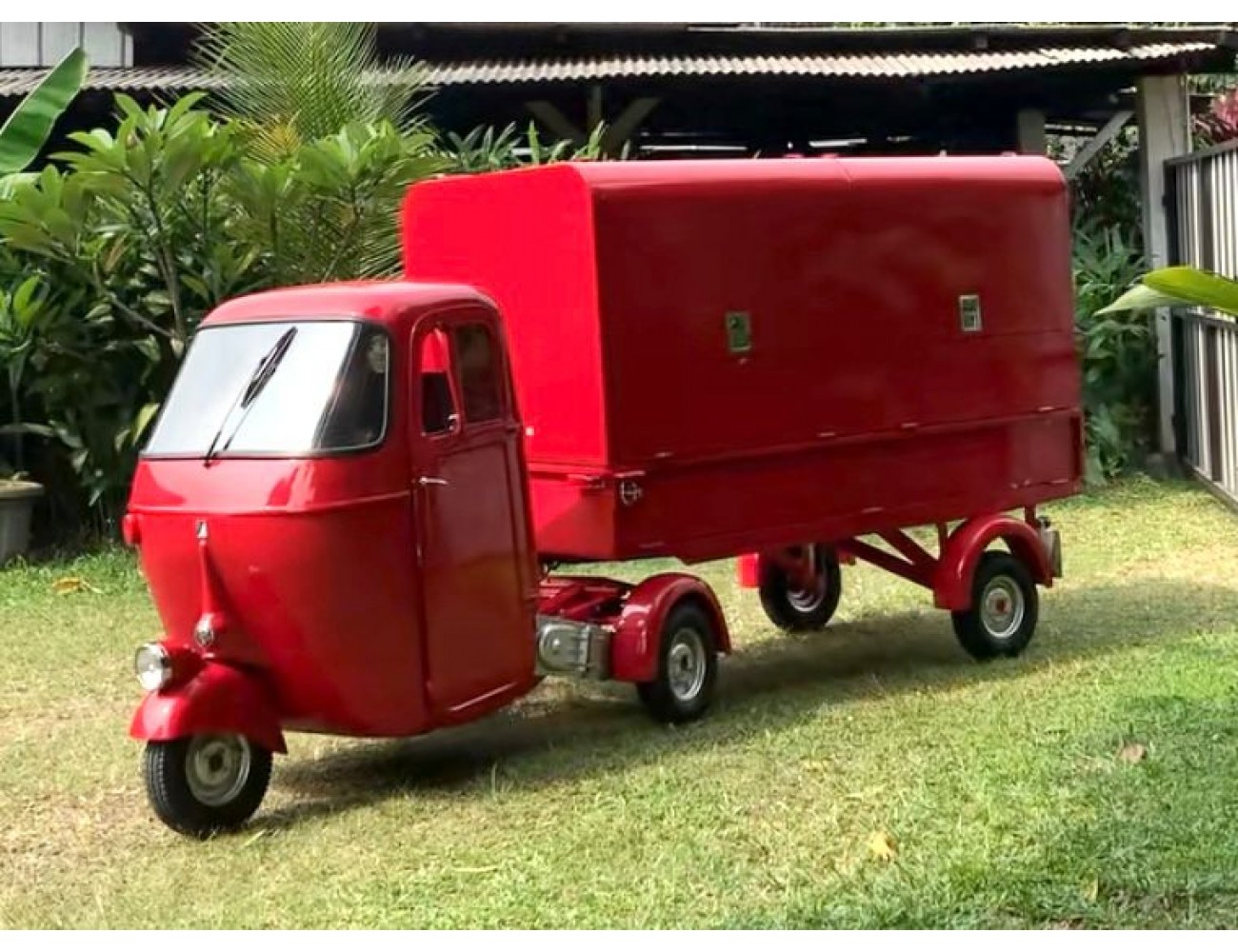 The Ape Vespa Bajaj Wings Box Red is a fully restored 150cc three‑wheeler with a lift‑up wings roof and fold‑out counter—an instant mobile shop for coffee, snacks, pop‑ups, and brand activations. Compact, efficient, and unmistakably iconic.