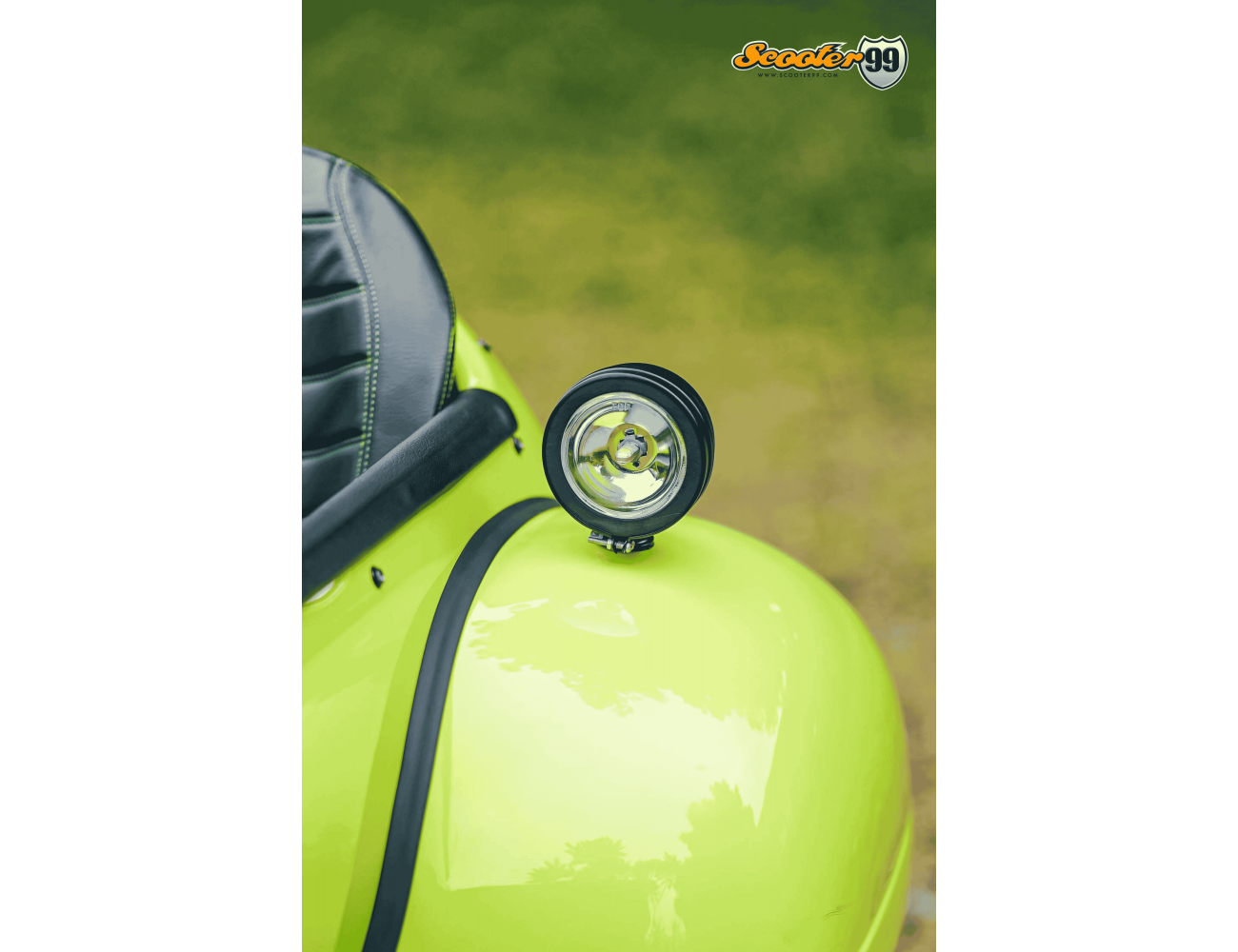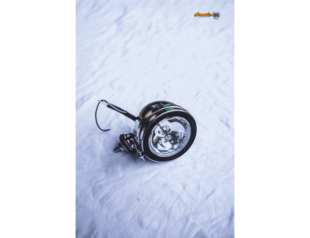 The Sidecar Fender Lamp is a retro-style auxiliary light that adds both visibility and vintage character to your sidecar or scooter. Built with a polished chrome metal housing and a clear glass lens, it delivers a crisp, focused beam while matching the timeless look of classic Vespa, Lambretta, and Royal Enfield builds. Compact, durable, and easy to mount — a small detail that makes a big difference.