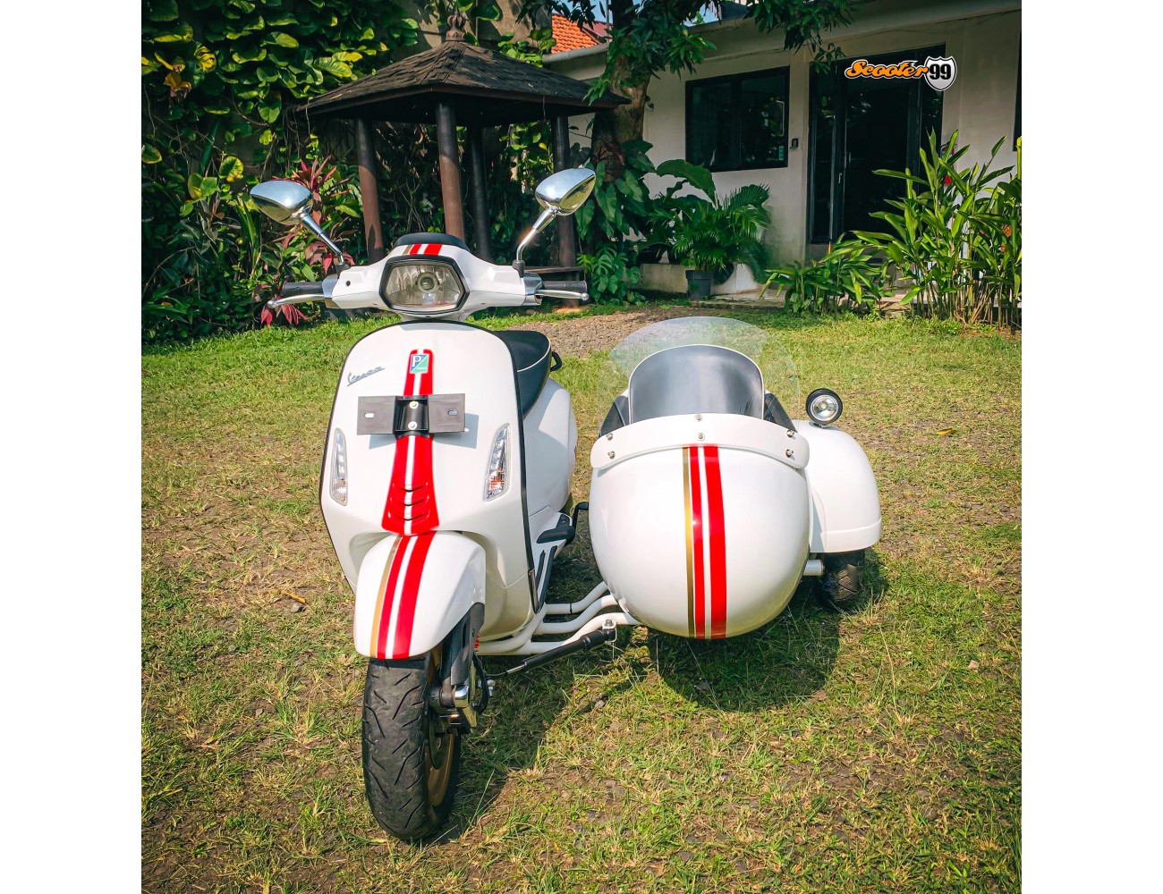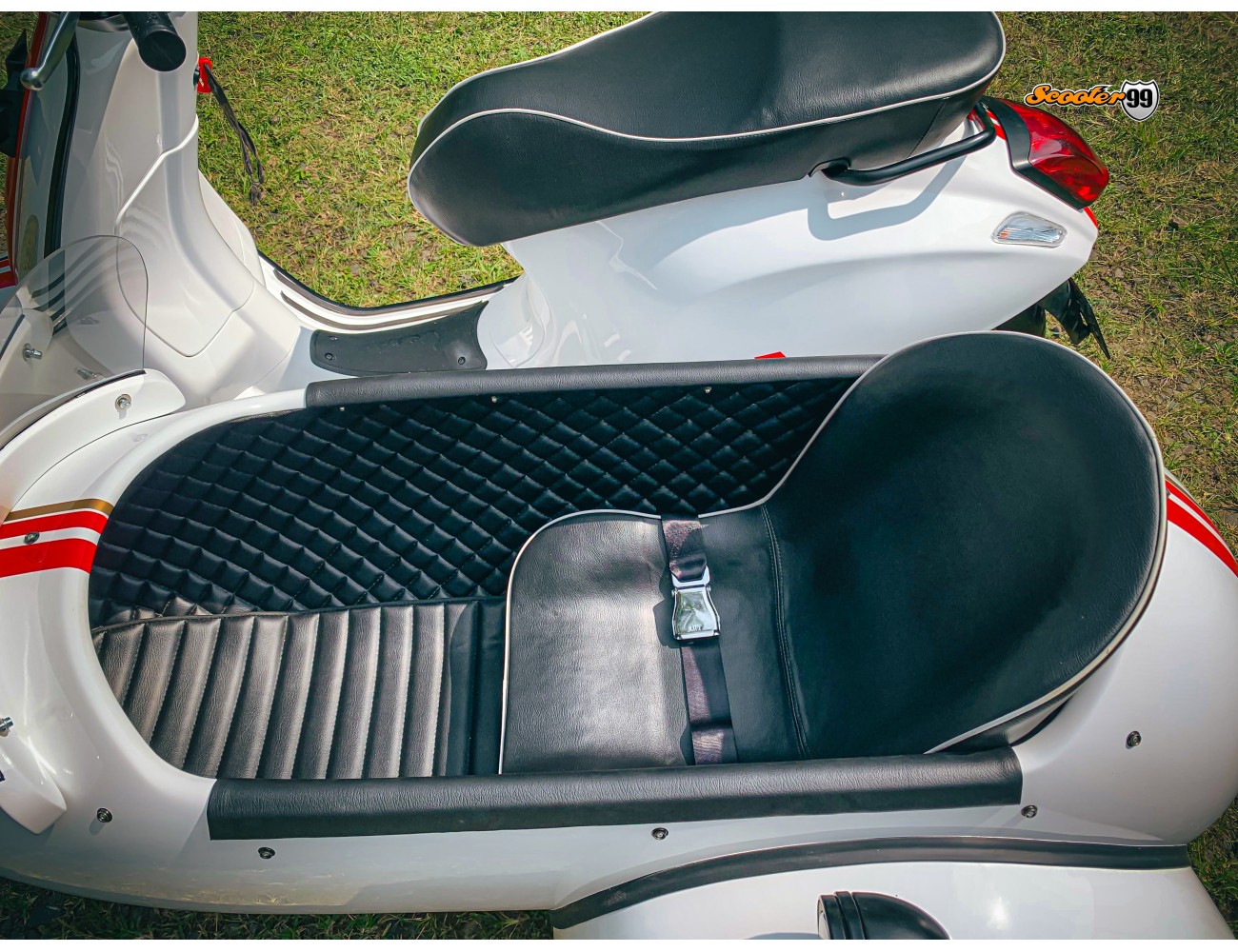 The White Red Stripe Sidecar Kit by Scooter99 blends classic European curves with modern sport styling. Built with a hand‑laid fiberglass body on a ¾‑inch tubular seamless steel frame, this detachable sidecar adds stability, comfort, and a bold look to scooters such as Vespa Primavera and Sprint. Finished in glossy pearl white with dual racing stripes in red and gold, it’s engineered for city cruising, weekend touring, and lifestyle content creation.
