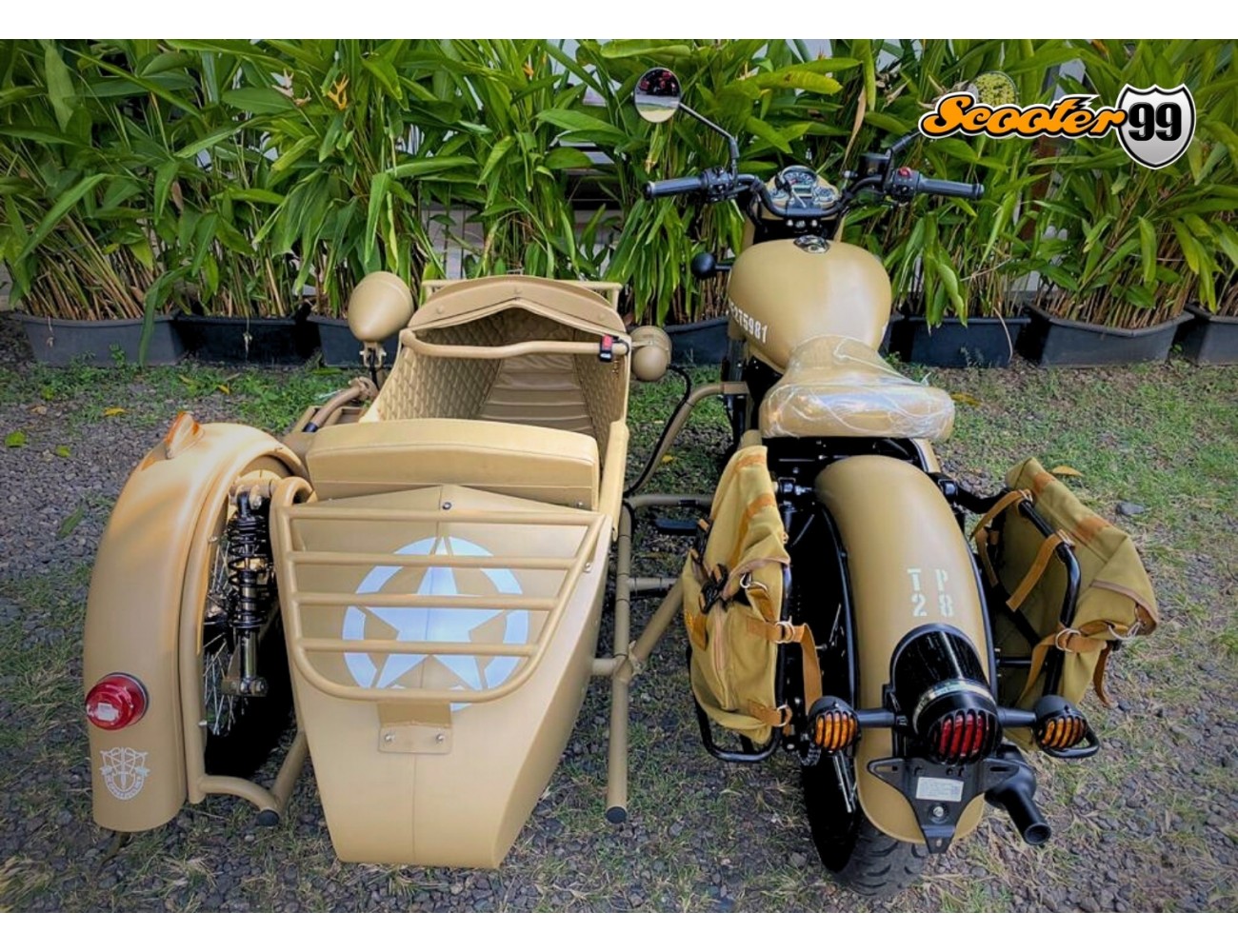 The Military Style Sidecar is a handcrafted touring sidecar built for the Royal Enfield Classic series. It features a 1-inch seamless tubular steel frame, durable steel body plate, quilted interior, and a handmade passenger seat. Finished in desert sand matte with vintage insignia, it includes a classic fender light, front luggage rack, and side-mounted jerry can. Optional windshield and rain cover are available. Left- or right-hand mounting.
