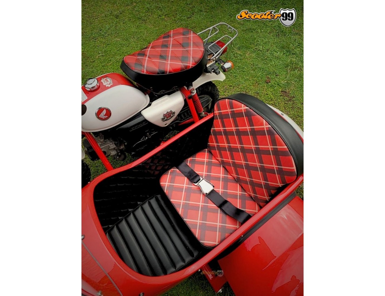 The Honda Monkey Sidecar – Red & White Classic Edition by Scooter99 is a compact, handcrafted sidecar tailored to the Monkey’s playful proportions. Its hand‑laminated fiberglass tub sits on a ¾‑inch tubular steel sub‑frame for lightweight strength and balanced handling. The teardrop silhouette, red‑tartan seat, and quilt‑stitched black interior deliver vintage touring character, while the removable acrylic windshield and integrated round LED headlamp add everyday usability. A detachable mounting kit lets you switch between solo and sidecar setups with ease.